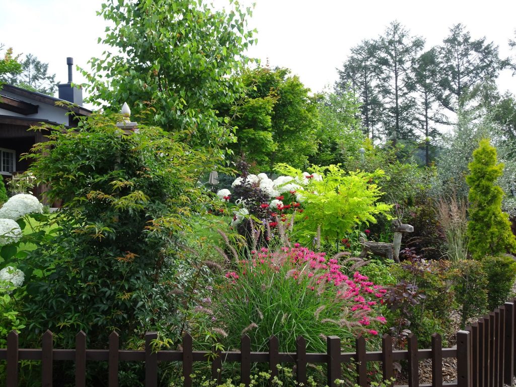 モナルダのピンクがひときわ目立ちます。小さな苗だったゴールデンアカシアも成長しました。