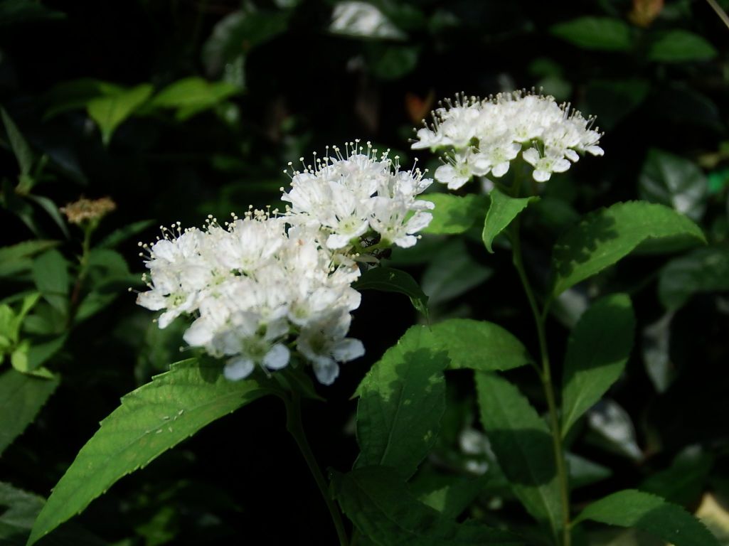 このシモツケは源平咲きなので白とピンク色の花が咲くのですが今は白一色に咲いてます、今年の夏は特別に暑い日が多いですが、白い花は涼しげですね