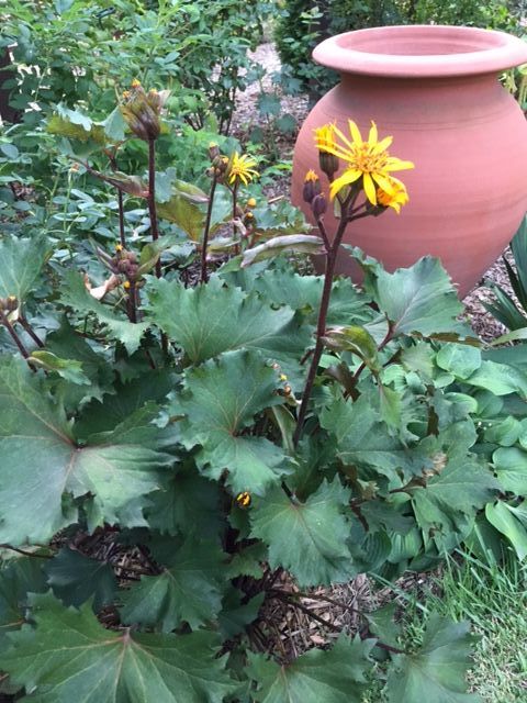 これも矮性なのですが昨年の倍の大きさになりました。 壺をバックに花茎がたくさん立っています。