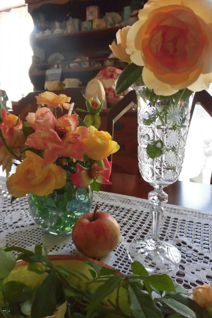 お花はトロピカルシャーベットとボヘミアングラスにグラハムトーマス・一つ落っこちてたリンゴ