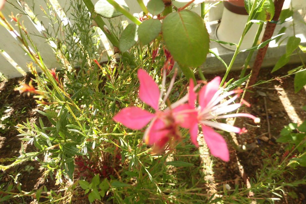 赤いガウラの咲き始め!葡萄棚で少し陰にあるため開花も白の日当たりの良いガウラより遅め