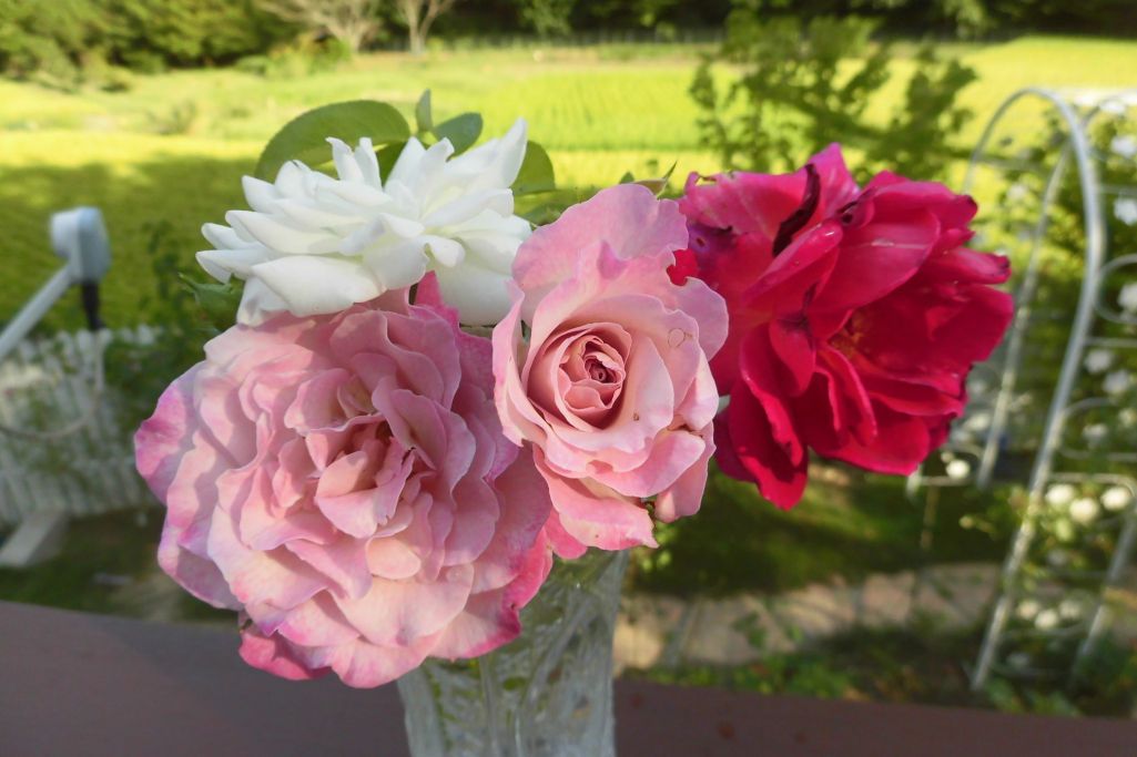 ライラックタイムは濃いピンク色、1年苗を購入したので、夏剪定で花瓶で楽しむことにしました。ライラックローズはいい香り!
