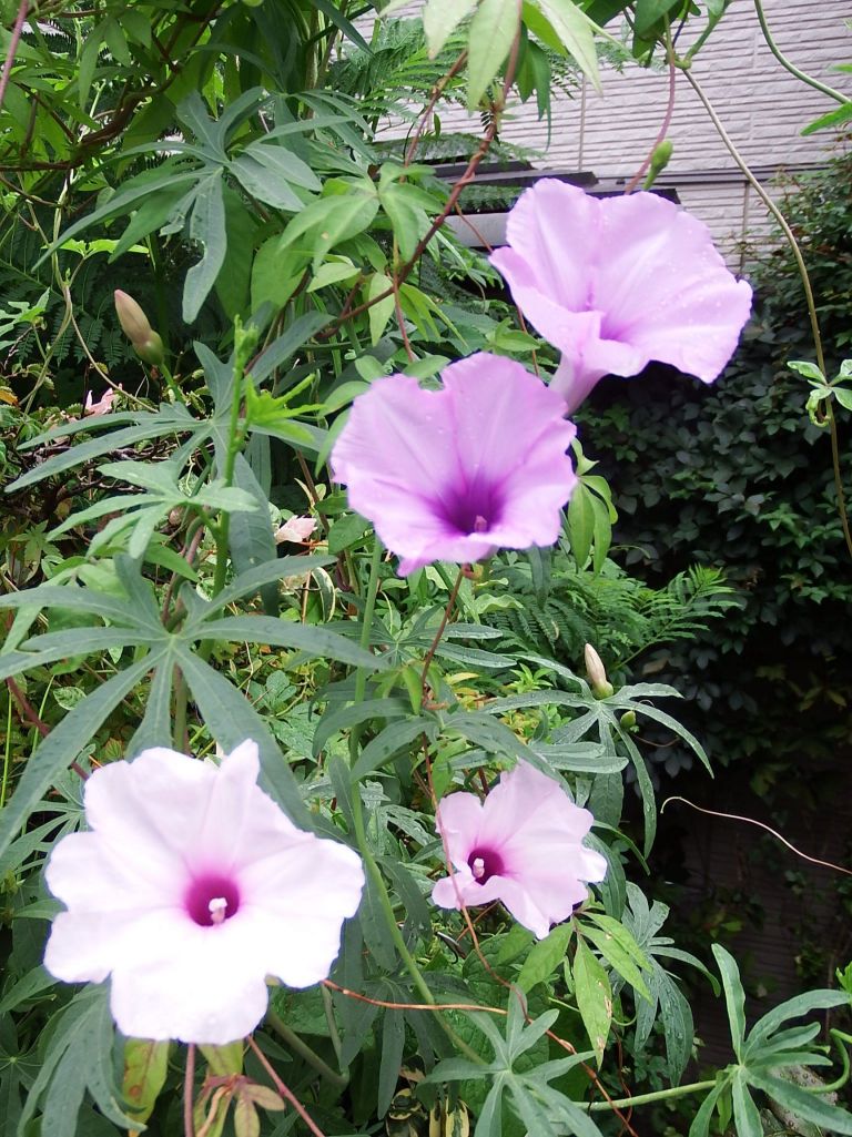 イポメアの花が咲いてます 上の2個はモミジバアサガオ 下の2個がイポメア プラテンシス です 花の他に塊根も楽しめます