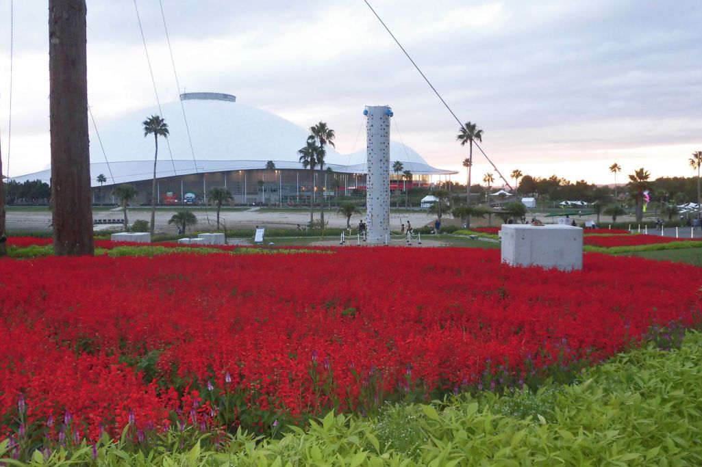 真っ赤なサルビアは雨上がりに美しい!遠くにキララドーム