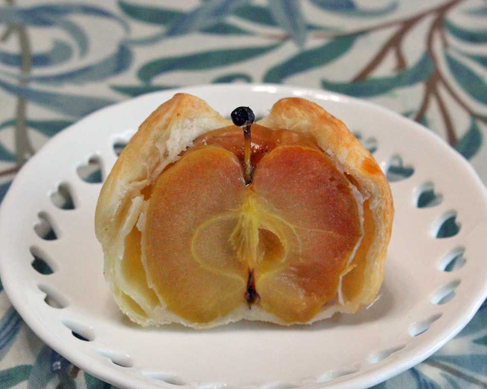 芯をぬかずにそのまま煮て、パイ生地で包んで焼いています。食べるときに種を出すのがちょっと面倒・・