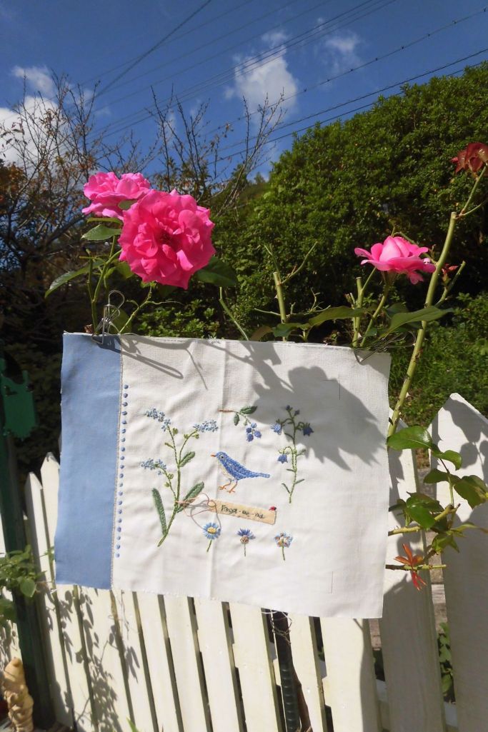 マヌーメイアンと青空にこの刺繍も青木和子さんのカラーコレクションですが、青い鳥を我が家にいたインコのピーちゃんにして仕上げを変えました。とっても素敵でしょ!幸せの青い鳥なんです。