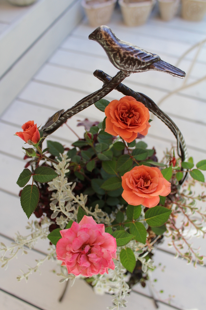 やはり、小鳥さんに目がとまってしまいます♪そして、なんと、ハイセンスな、シックなお色のバラの組み合わせ!抜群ですネ♪