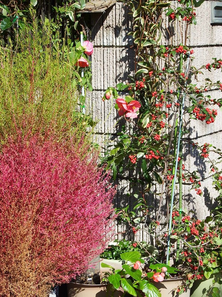 11月16日 初冬の陽だまりの彩 コキアの紅葉 コトネアスターの赤い実 アブチロンの花 ベゴニア・ドラゴンウイング