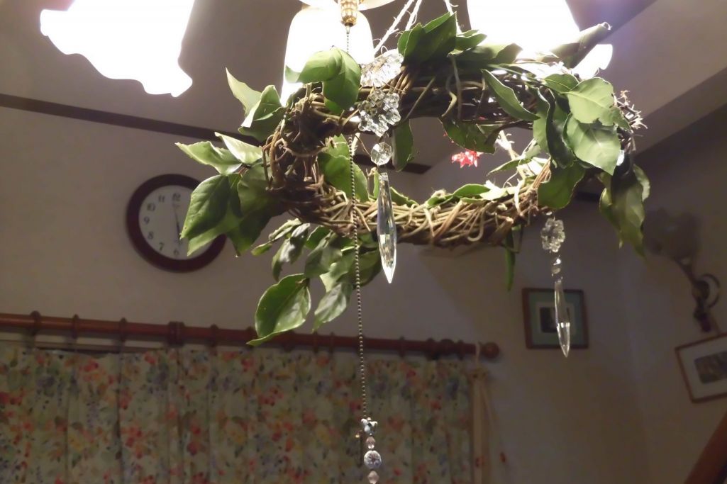 くずの蔓で出来たリースを友人からプレゼントされたので、我が家流リースには月桂樹の葉を付けました。