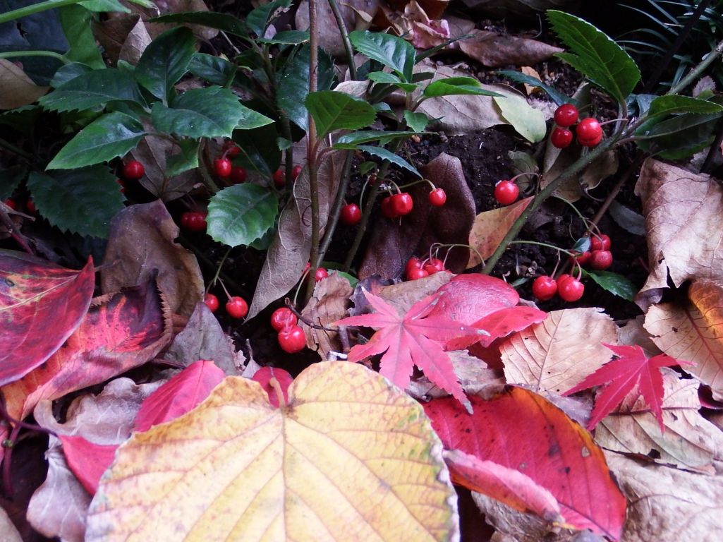 12月10日 今朝の庭、ツルコウジの赤い実と紅葉した落ち葉のコラボです