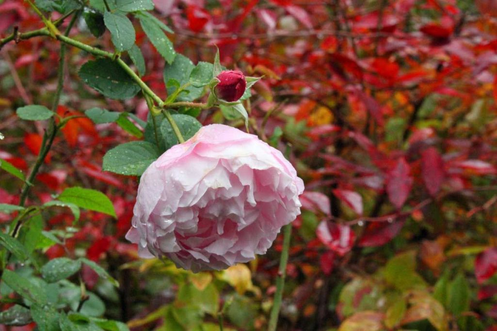 冷たい雨の中でひっそりと咲くメアリーローズ