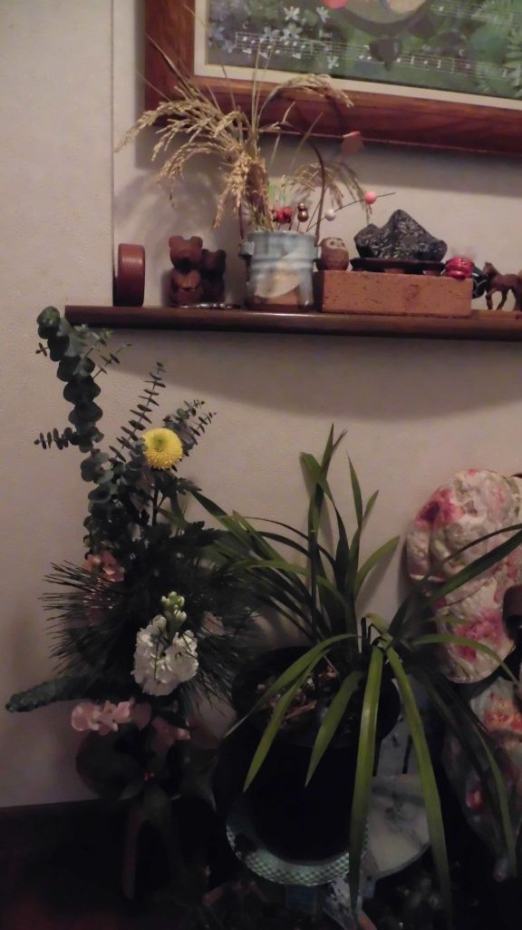 玄関中に生け花を生けました。シンピジュウムも小さな蕾をつけてます。飾りは稲穂とちょっとにぎやかな玄関中