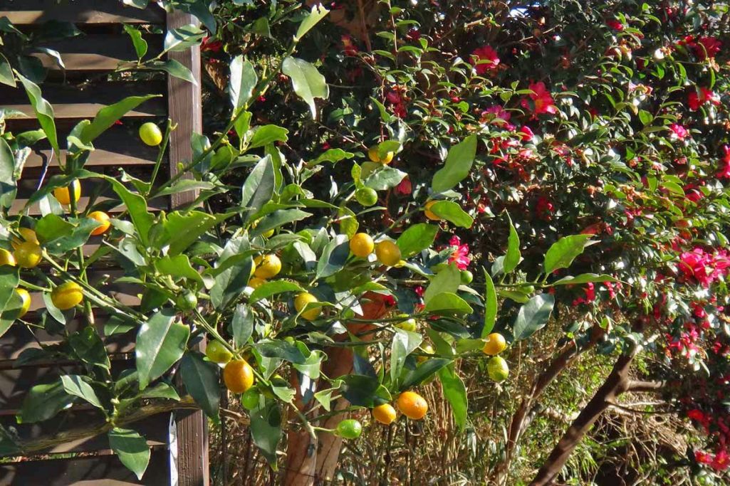 ルーバーラティスに扇仕立てのように誘引した種なし金柑です。うしろのサザンカの花はそろそろ終わりそうです。