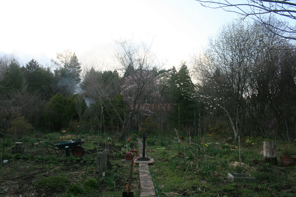 中央に写っているのは日時計ですか?何気なく置かれた一輪車やスコップですが絵になりますね~!我が家の畑は雑然としているので写真に撮れません・・・(>_