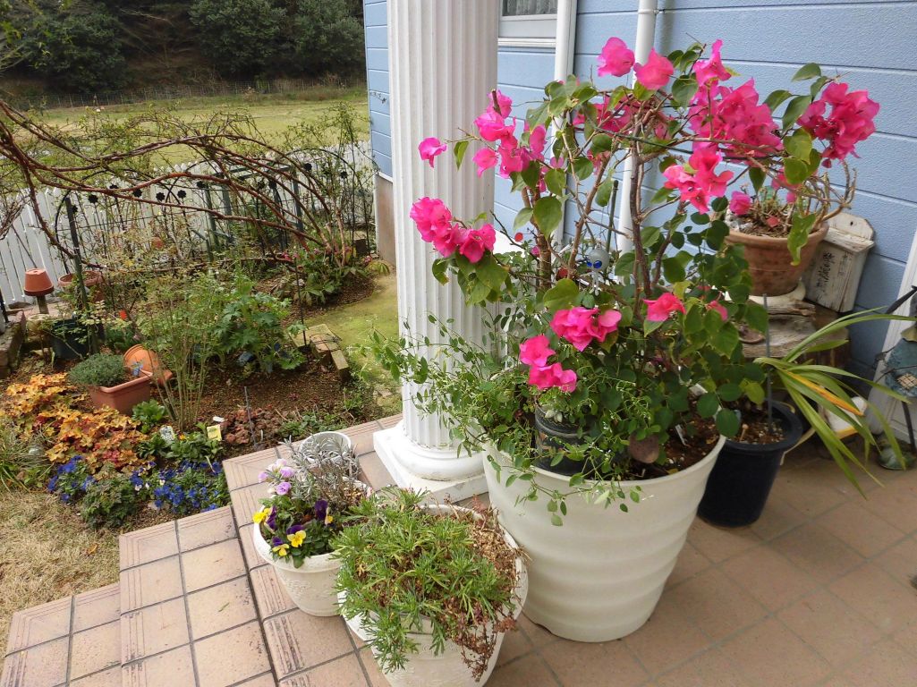 かなり楽しませてくれたブーゲンビリアと薔薇の寄せ植え等をお部屋から移動します。