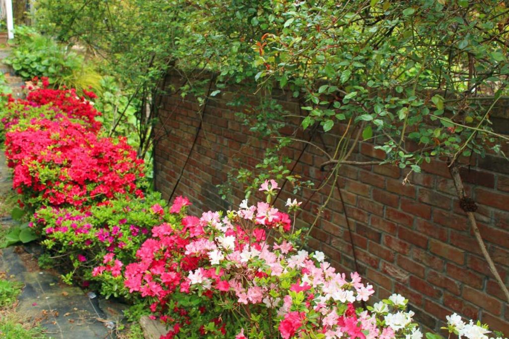 ツルバラのレンガ塀の後ろには久留米ツツジが満開です・・