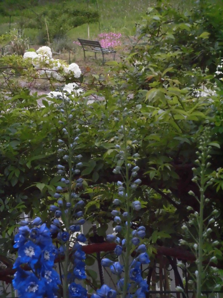 手前デルフィニウムから、モッコウバラ、オオデマリ、そうしてベンチの前にシレネと薔薇、その向こうには菖蒲まで