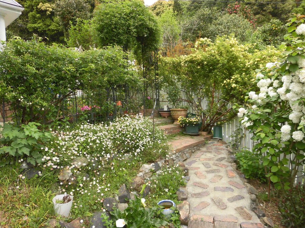 黄モッコウと白モッコウ薔薇がそろそろ饗宴 白のオオデマリや小さなエリゲロン、斑入りのカラーと少しさびしいけれど可愛いです。