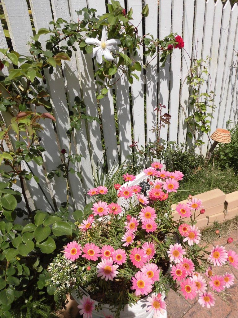 クレマチスと薔薇フレグラント・オールド・パープル 手前の鉢はマーガレット