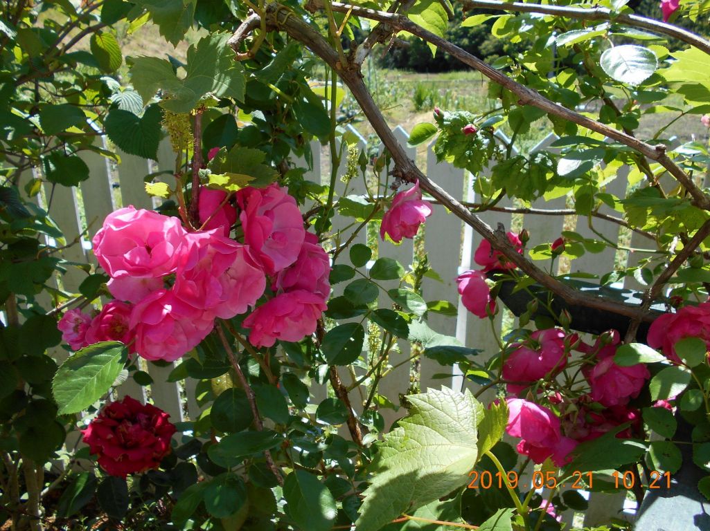 葡萄棚の側にあるアンジェラは隣に、イングリットバーグマン、オオデマリがあり、少し競争しあってるように咲き乱れてます。