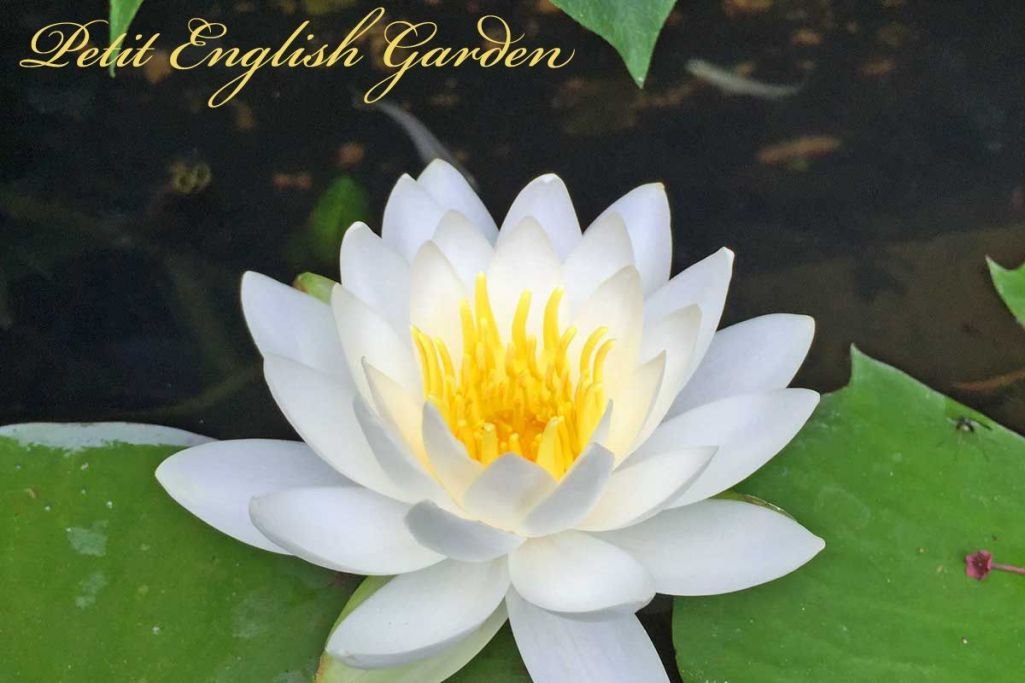 ボウフラ除けにメダカを飼っていますが、白っぽいメダカが花の後ろで泳いでいます。