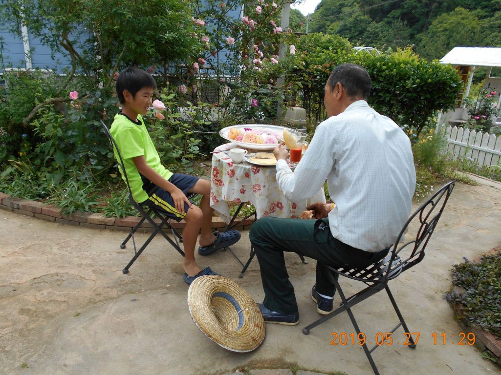 孫の手作りでじい様一休憩(ペンキ塗り)・・・今日の夕方からの雨にウッドデッキ塗り残しのペンキ塗り