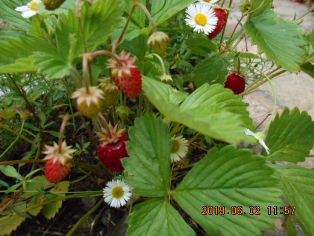 大きく実ってます。エリゲロンのお花と比べてみたら・・ね。苺の妖精が出てきそう