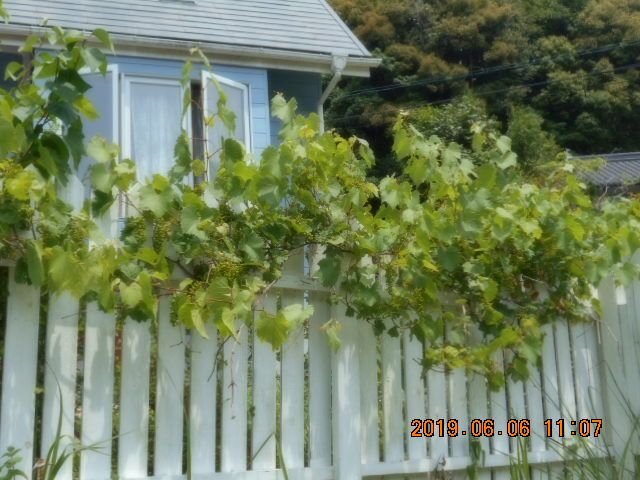 小さな葡萄がたわわに!北九州のとある、お店の窓辺にあった葡萄に魅せられて我が家にも植えて、もう何年でしょうか。フェンスのお陰てこのようにもたれてます。ひょっこり、もうすぐ、アーティーチョウクも顔を出してきます。