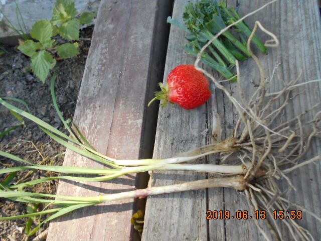 ニラの根っこを見たのは初めて!苺も一つありました。