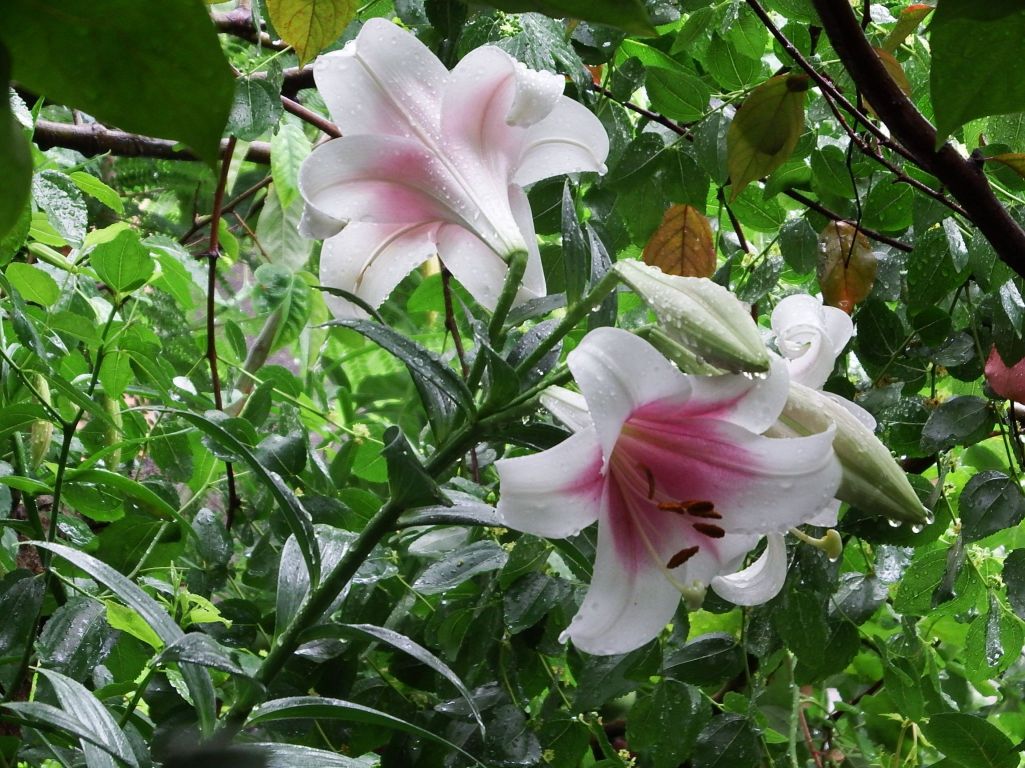 狭い我が家の庭の隅で梅雨に濡れて咲く百合の花です、ちょっとだけ高原の気分の味わい O・L HYBRID LILY シラーノ