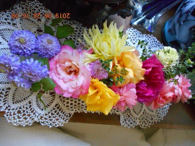 雨の合間をぬって、薔薇の花とあそんでます。そう、ダリアも咲き始めたので、一輪添えました。スカビオーサは藤色とピンク、タイムの斑入りも一緒に添えました。