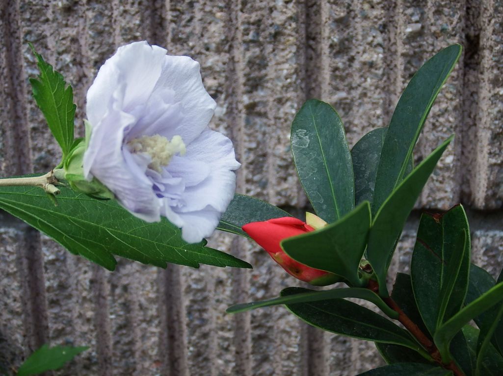 ムクゲ ブルーシフォンの花とアザレア椿の赤い蕾です
