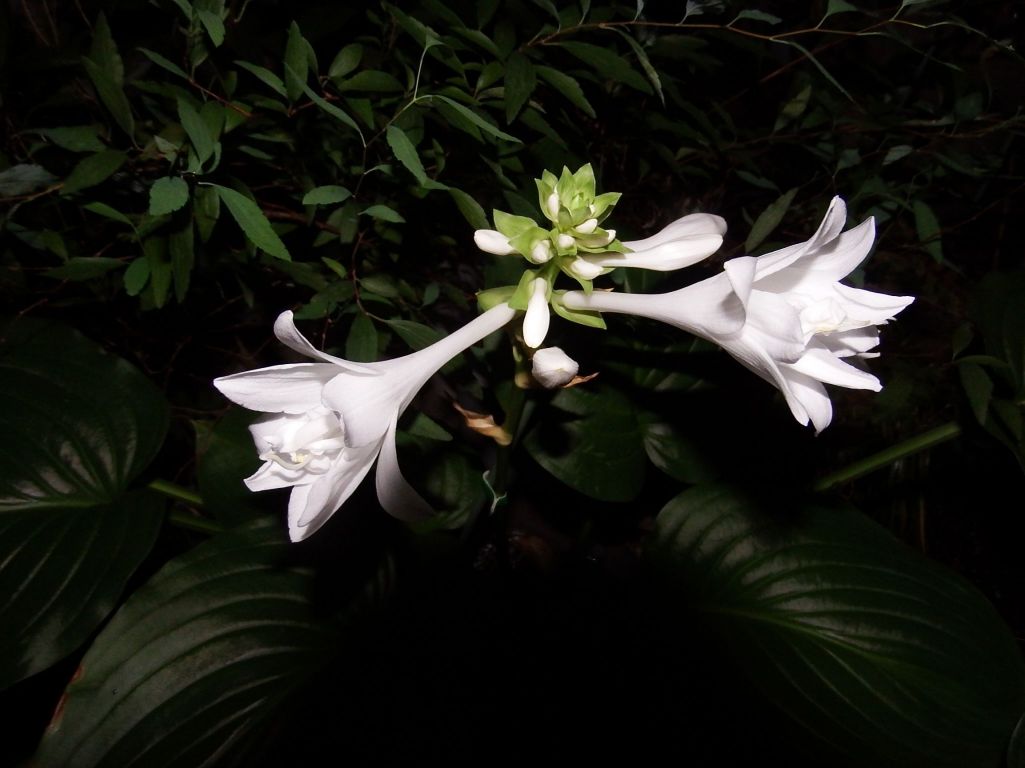 ギボウシ・八重咲タマノカンザシ 夜に咲いて朝には清楚な純白の面影をとどめてはいますが萎み始めています