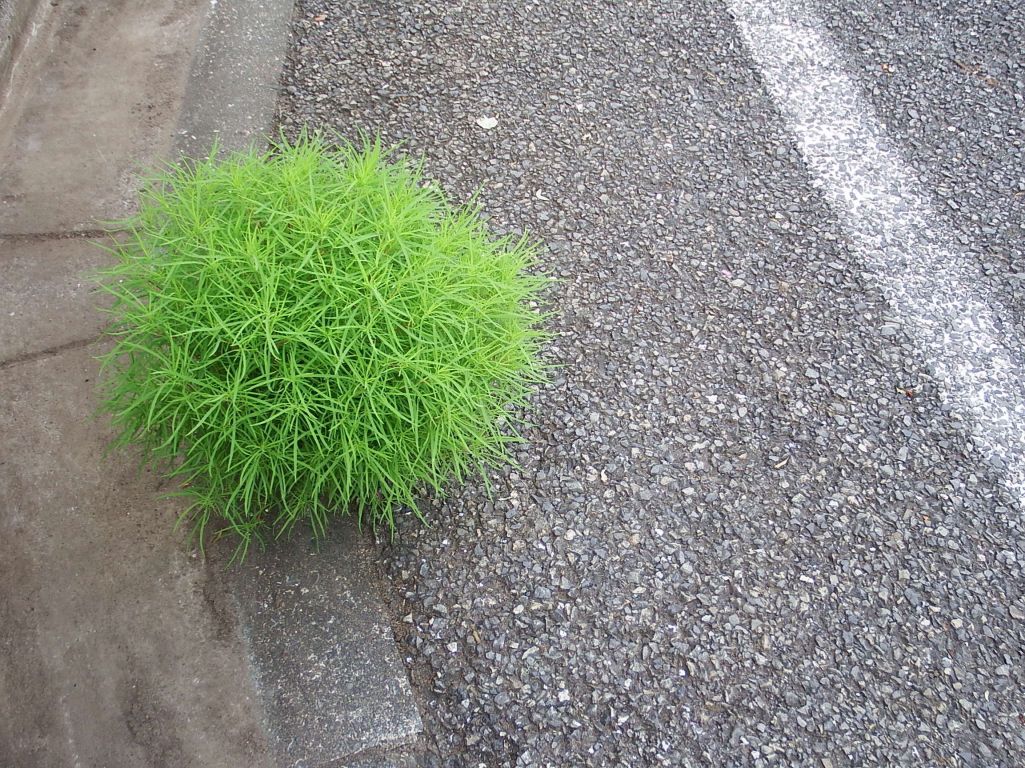 アスファルト道路と側溝の蓋のわずかな隙間に根をはって逞しく生きているこぼれ種からのコキア、首都圏直撃の台風15号にも負けずに頑張ってます