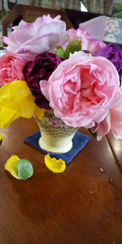 今にも雨が・・お庭の薔薇をお部屋に・・プリンセスマサコ開花です。黄色のイングリットバーグマンは先日から活けたので、もう、花びらが散り始めました。嵐の二宮君カラーの話題提供に・・