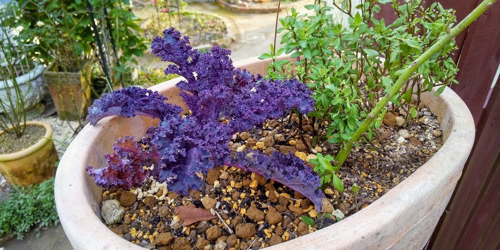 大好きなデージーとレッドアッシュカールにミニ薔薇の寄せ植えは植え替え時に葉ボタンをプラスしただけ