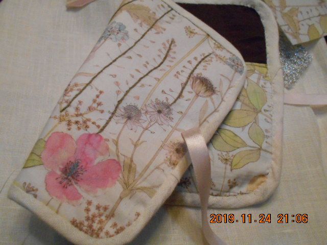 クリスマスプレゼントの作品にもやっぱり、花柄、ほんの少しの刺繍ですが、お花の優しさが伝わってくれるかな