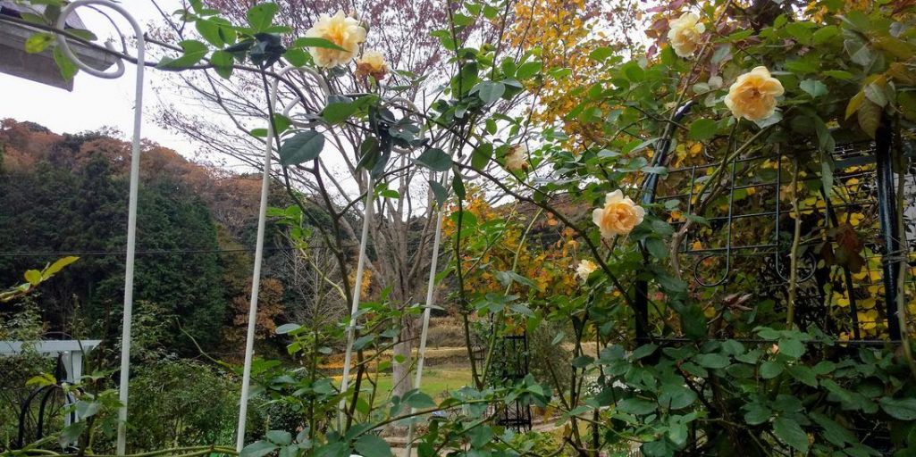 バフびゅーティーがちらほらと咲いてハマボウの黄色く色づいた中、ロマンチック!