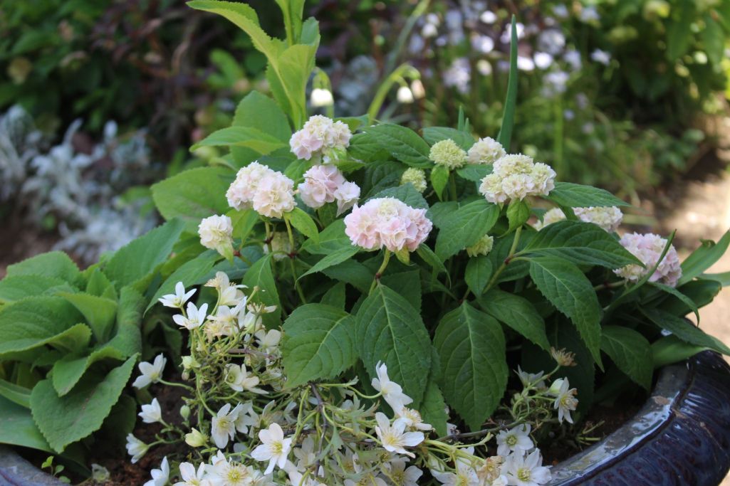 鉢植えの状態がベストなハイドランジア ”伊予獅子” 全体的に小さくてとても可愛い紫陽花です。 クレマチス カートマニージョーとコラボ