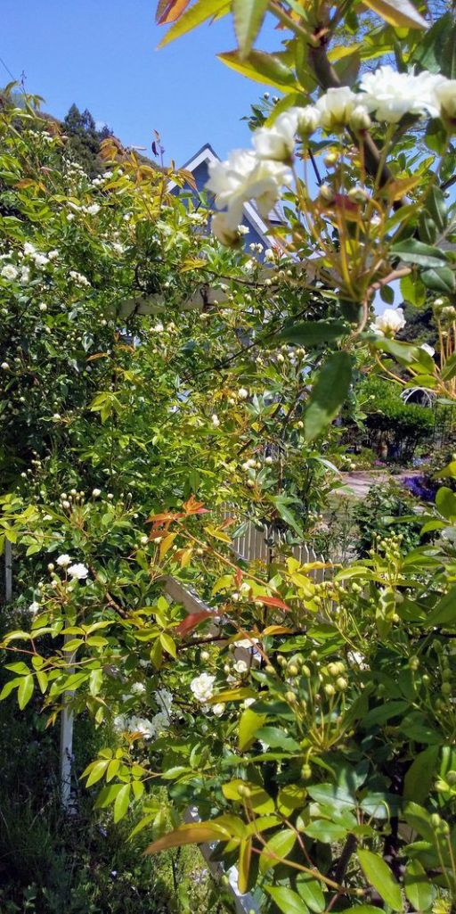 土手に植えた白モッコウバラともうすぐコラボのジャーマンアイリス開花待ち