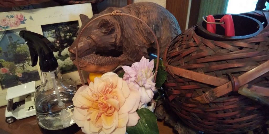 切り花で・・・隣にはスプレーアルコール消毒液 コロナ対策のための必需品となってます。来客よりも家族が外出から帰れば消毒!