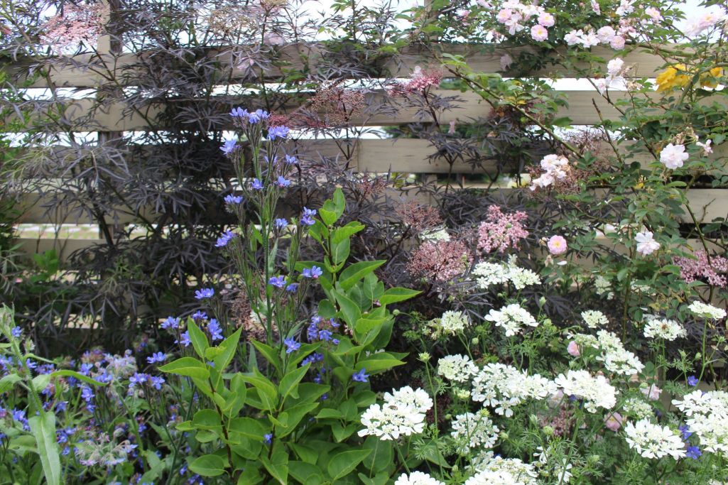 白いオルレア、 青いアンチューサ 銅葉にピンクの花はニワトコがコラボする庭