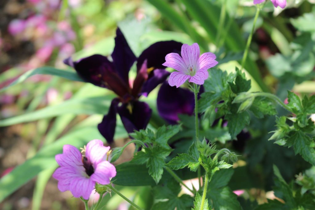 ピンクのゲラ二ウムと、あやめ開花