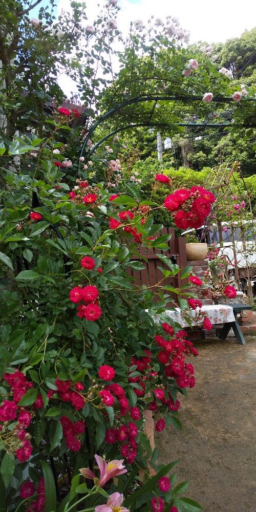アーチには空に向かって、シンデレラが伸びています。反対側からはバフビューティーが早く咲き始め、向かい合ってアーチにメロディーを・・・ 鉢植えには赤いミニ薔薇がやはり勢いよく!アルストロメリアやヒューゲラ、少し陰になってはいますが、アブラハムダービーで、この坂を下ると・・・遊べる庭とテーマを付けた芝生のあるガーデンです。