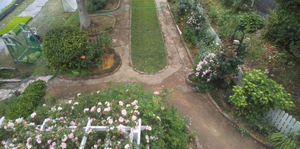 少しパーゴラも古びてますが、アルベルティーヌが咲いてます。孫たちはこの位置で庭を見下ろしているのかな