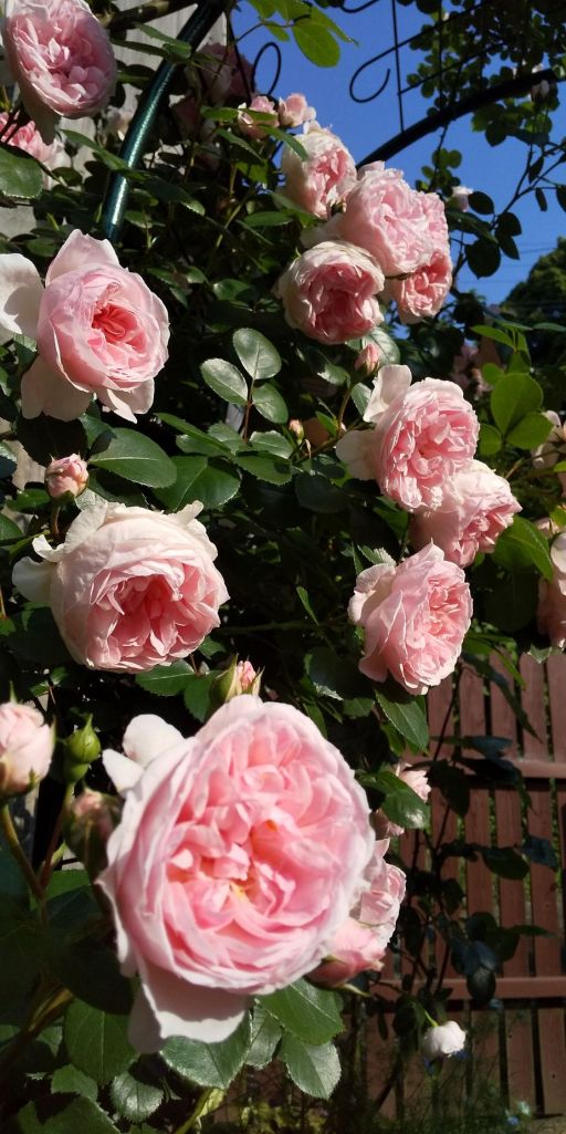 可愛い!アーチの中で一番最後に花をつけるのも場所が少し日陰、優しくて、可愛い薔薇にウットリです。スプレイ咲だから、たわわに咲いてます。