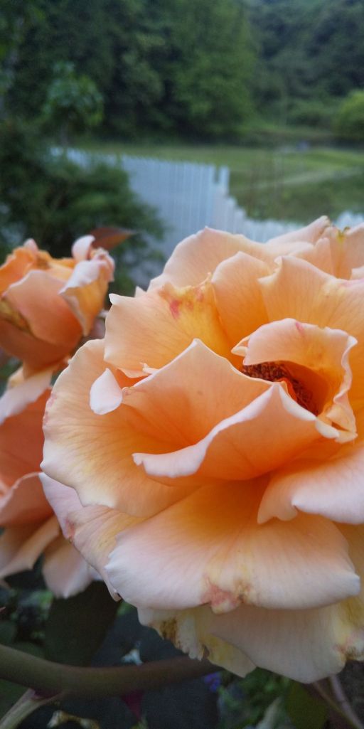 田植え時期に咲く薔薇も絵になります。遠くに水田、今日畔の草刈り!