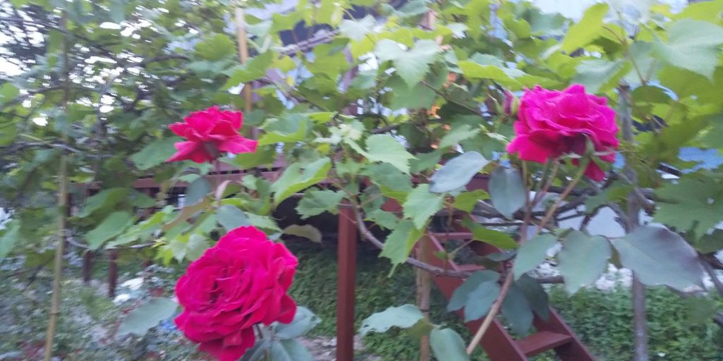 ブドウの葉が薔薇を引き立てて美しいですね。