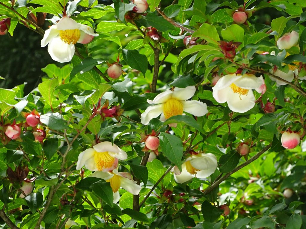 英彦山神宮(福岡県)のヒコサンヒメシャラ(英彦山姫沙羅)が見頃でした!花びらの端がほんのりピンクに色付き、蕾は可愛い手毬のようです。