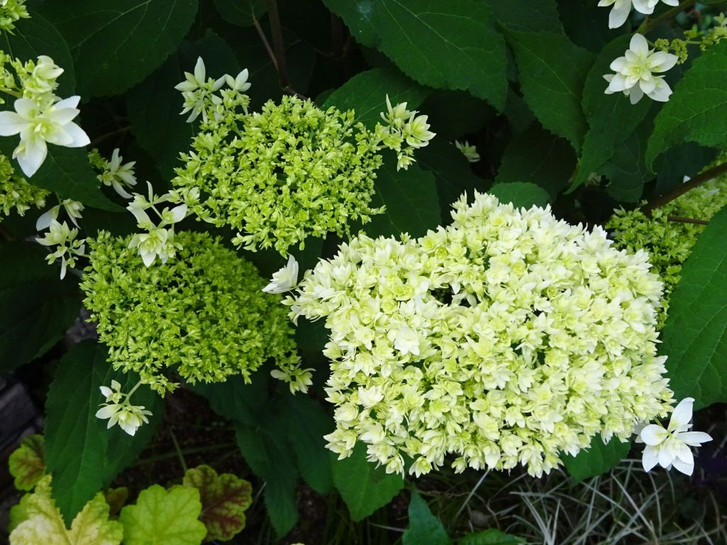 ヘイズスターバースト・・満開時は柔らかい真っ白い球状に。グリーン、白、グリーンへと変化するお気に入りのアジサイ。
